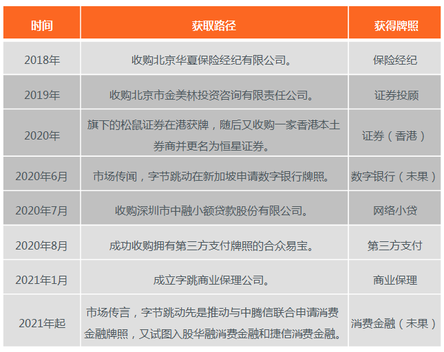 表:字节跳动谋求金融牌照相关动作