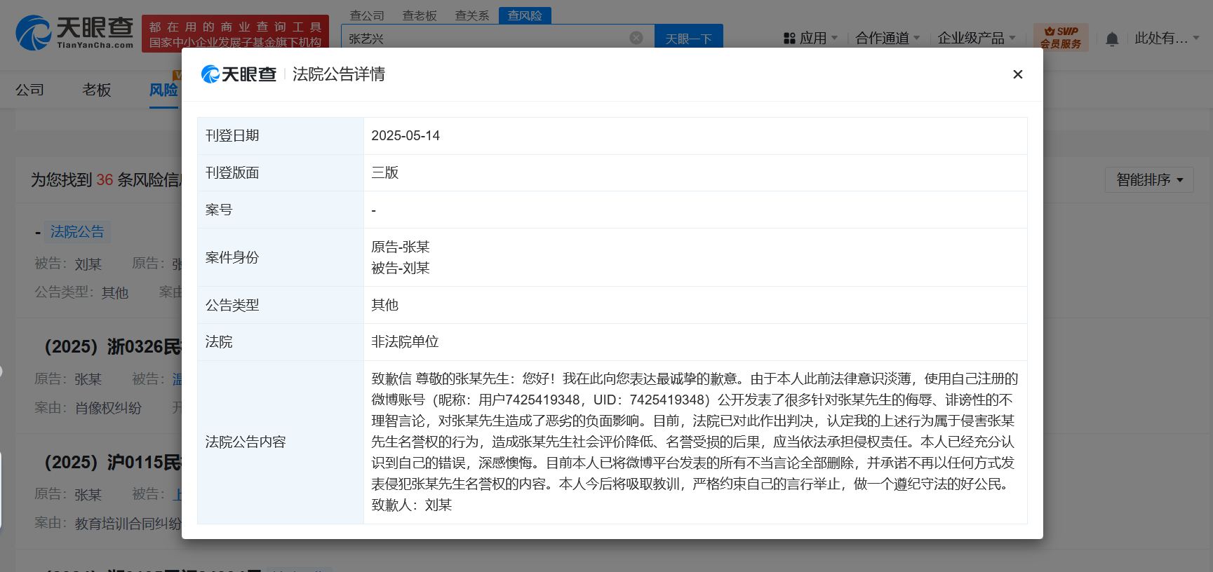 天眼查法律诉讼信息显示,近日,法院公布刘某向张艺兴的致歉声明,内容显示,刘某使用自己注册的微博账号公开发表了很多针对张艺兴的侮辱、诽谤性的不理智言论,对张艺兴造成了恶劣的负面影响。