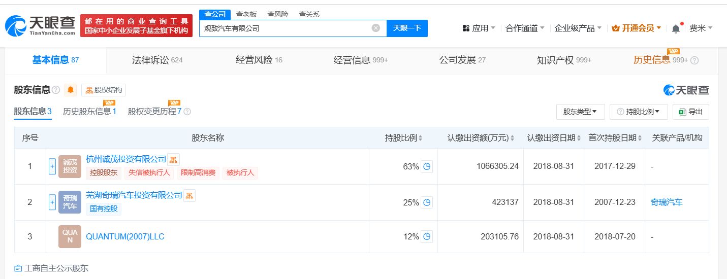 观致汽车有限公司成立于2007年12月,法定代表人为何华,注册资本约169.3亿人民币,经营范围包括车辆的研发和测试,技术服务及技术贸易等,由杭州诚茂投资有限公司、芜湖奇瑞汽车投资有限公司、Quantum(2007)LLC共同持股。