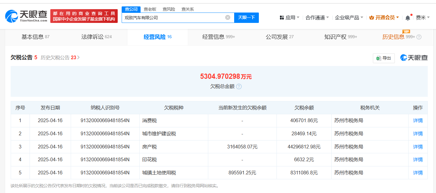 天眼查天眼风险信息显示,近日,观致汽车有限公司新增5则欠税公告,欠税总金额为5304万余元,欠税税种为消费税、城市维护建设税、城镇土地使用税、印花税、房产税。