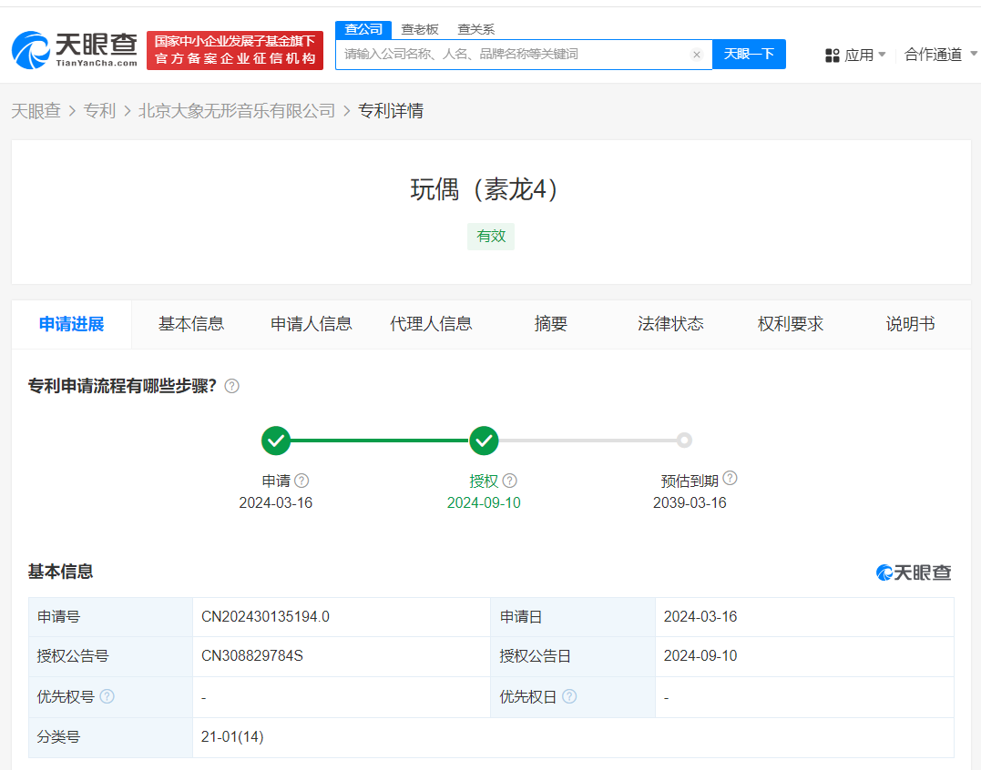 天眼查知识产权信息显示,9月10日,北京大象无形音乐有限公司申请的四项“玩偶(素龙1)”“玩偶(素龙2)”“玩偶(素龙3)”“玩偶(素龙4)”外观专利获授权。