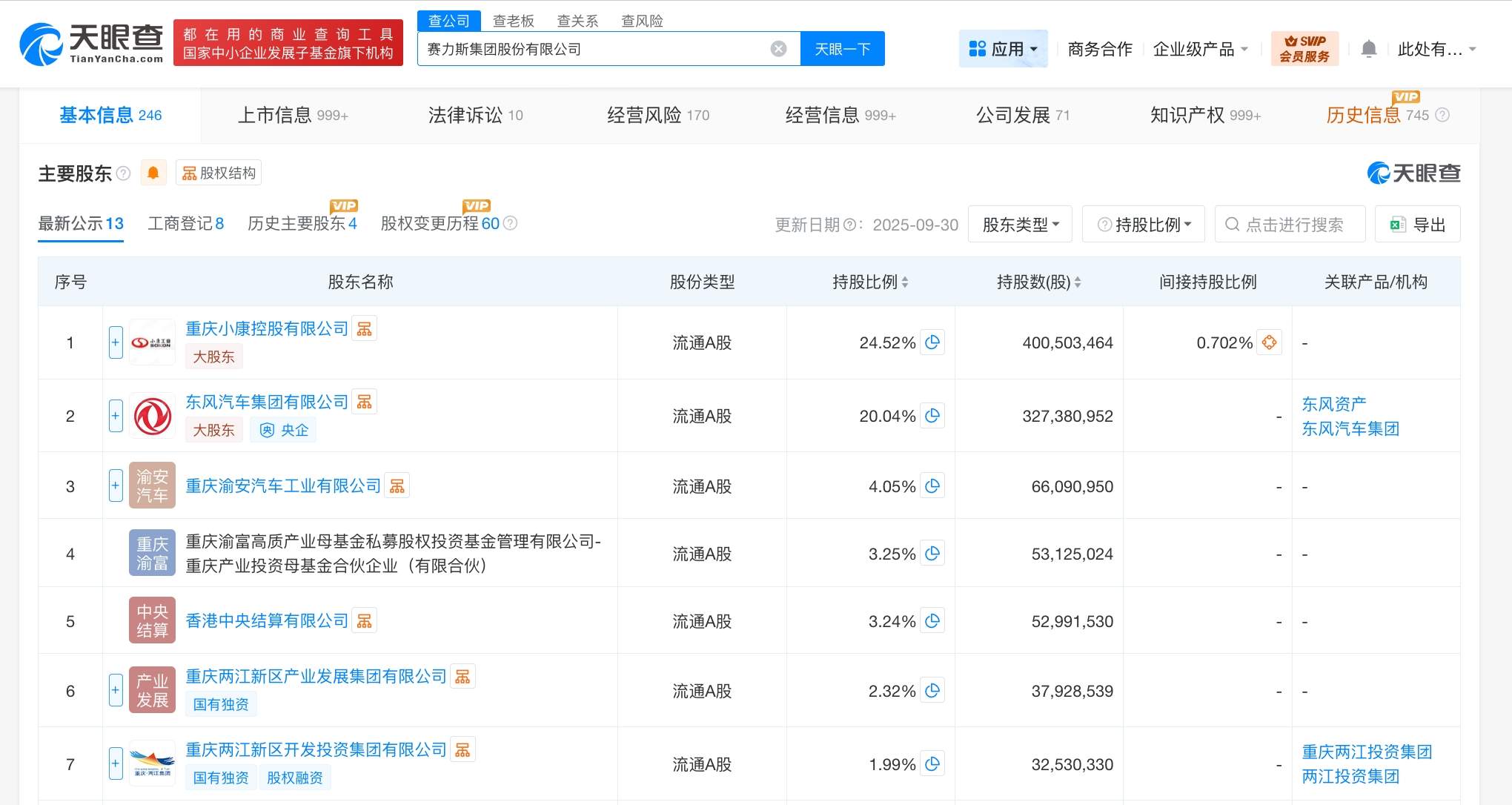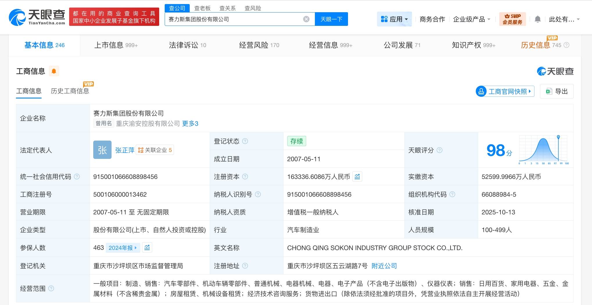 赛力斯集团股份有限公司成立于2007年5月,法定代表人为张正萍,注册资本约16.3亿人民币,经营范围含制造、销售汽车零部件、机动车辆零部件、普通机械、电器机械、电器、电子产品等。股东信息显示,该公司由重庆小康控股有限公司、东风汽车集团有限公司、重庆渝安汽车工业有限公司等共同持股。