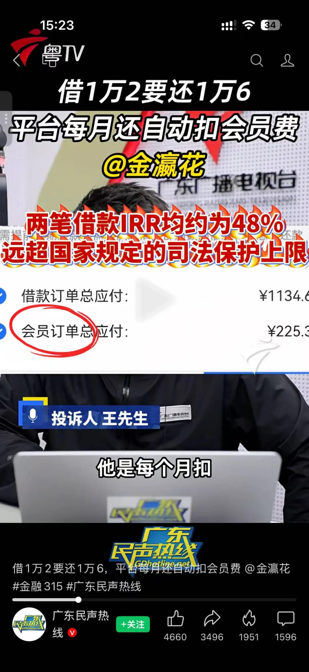 近日,有借款人向广东民生热线投诉,在金瀛花借款1.2W需还款1.6W,且平台每月还会自动扣除会员费。