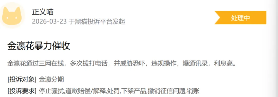 除高息之外,3月23日,有人投诉金瀛分期不断骚扰其亲朋好友。同日,还有人称该平台多次拨打电话,威胁恐吓借款人,并爆通讯录。
