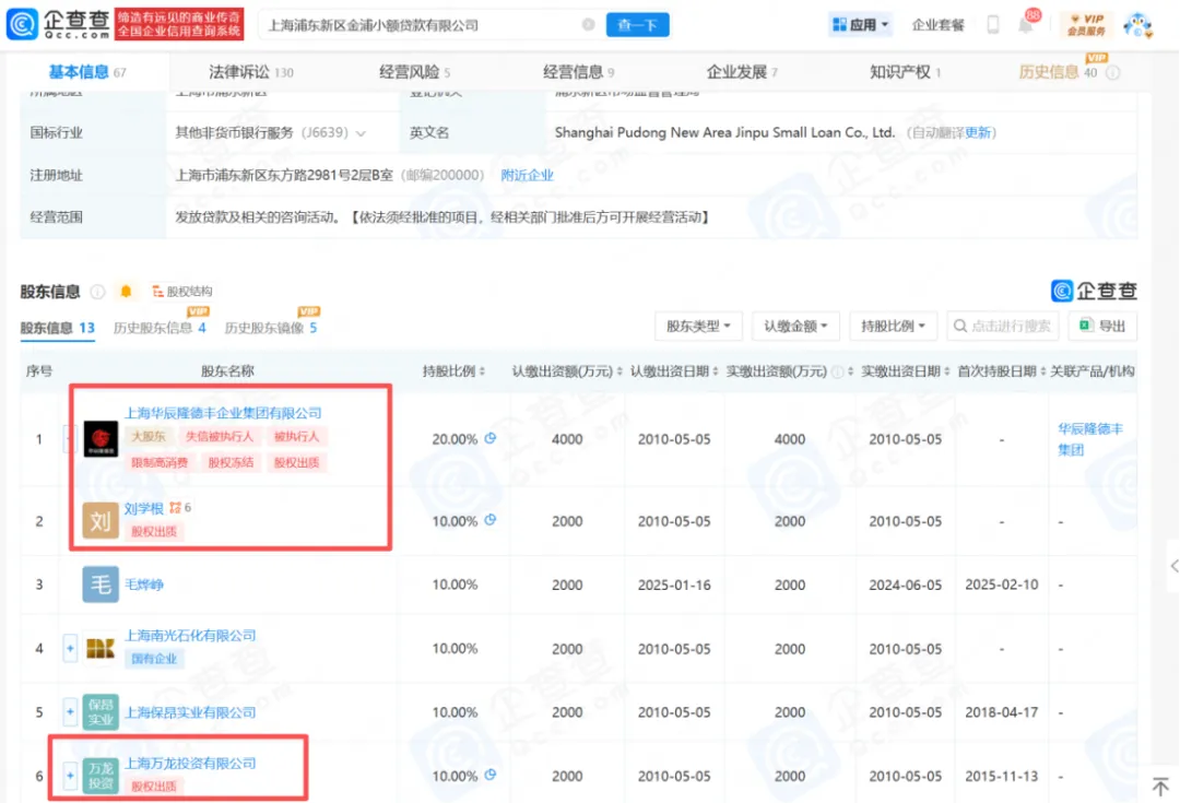 值得注意的是,目前,该公司大股东上海华辰隆德丰企业集团有限公司已成为失信被执行人。小股东刘学根、上海万龙投资有限公司均有股权出质。