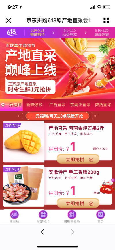“全民拼购日”主打全民1元超值拼,网罗海量好货,狂撒福利,造福消费者。如在“一元帮帮团”活动中,用户只需支付1元并邀请好友参与即可获得如一箱纸巾、三斤芒果等高价值商品,!在“9.9元超值团”中,低价爆款可以买到爽,全民9.9元嗨拼不限!在“红人带你拼”活动中,更有8位一线明星担任产品体验官,带领百位购物圈超级合伙人为消费者推荐京东拼购优质好货!“品牌特惠”更是为消费者精选了包括金龙鱼、美的、美赞臣、维达在内的众多大牌特惠商品!“原产地直采”优选全世界各地规模大、品质佳的的六大时令生鲜产业带,覆盖东南亚、广西、陕西、山东、湖北、江苏,为消费者提供低价不低质的时令生鲜好货。