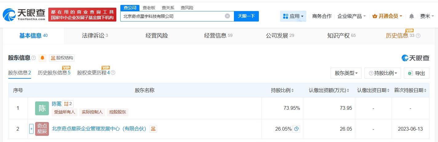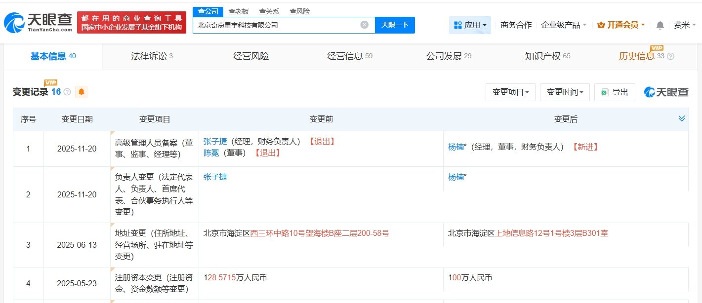 天眼查App显示,哩布哩布AI关联公司北京奇点星宇科技有限公司成立于2023年5月,经营范围包括服务消费机器人制造、工业机器人制造、工业机器人销售等,由陈冕、北京奇点星辰企业管理发展中心(有限合伙)共同持股。变更记录显示,去年11月,张子捷卸任该公司法定代表人、经理,陈冕卸任董事,杨楠接任法定代表人、董事、经理;去年5月,该公司注册资本由约129万人民币减至100万人民币。