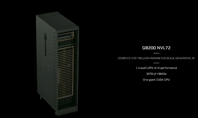 NVIDIA GB200 NVL72 是一种多节点、液冷、机架级系统,利用 Blackwell 为万亿参数模型提供强力计算,在单个机架中可实现 720 petaflops 的 AI 训练性能和1.4 exaflops 的AI推理性能。