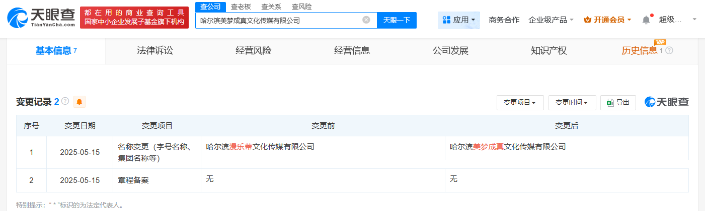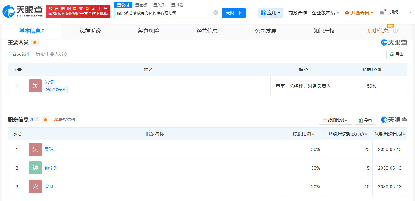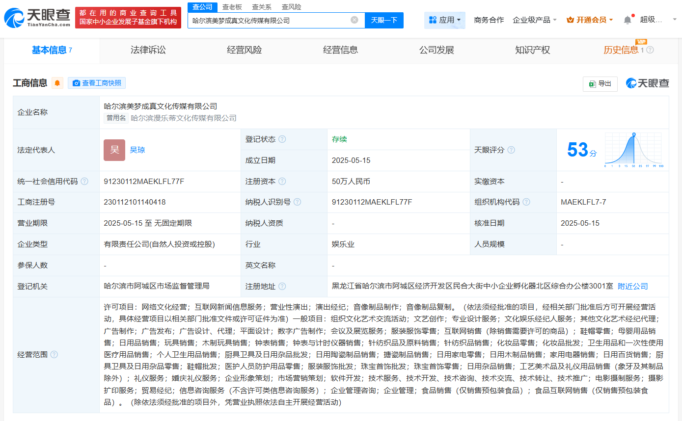天眼查App显示,今年5月,哈尔滨美梦成真文化传媒有限公司成立,法定代表人为吴琼(钟美美妈妈),注册资本50万人民币,经营范围包括网络文化经营、营业性演出、演出经纪等,由吴琼、钟宇升(钟美美)、安基共同持股。