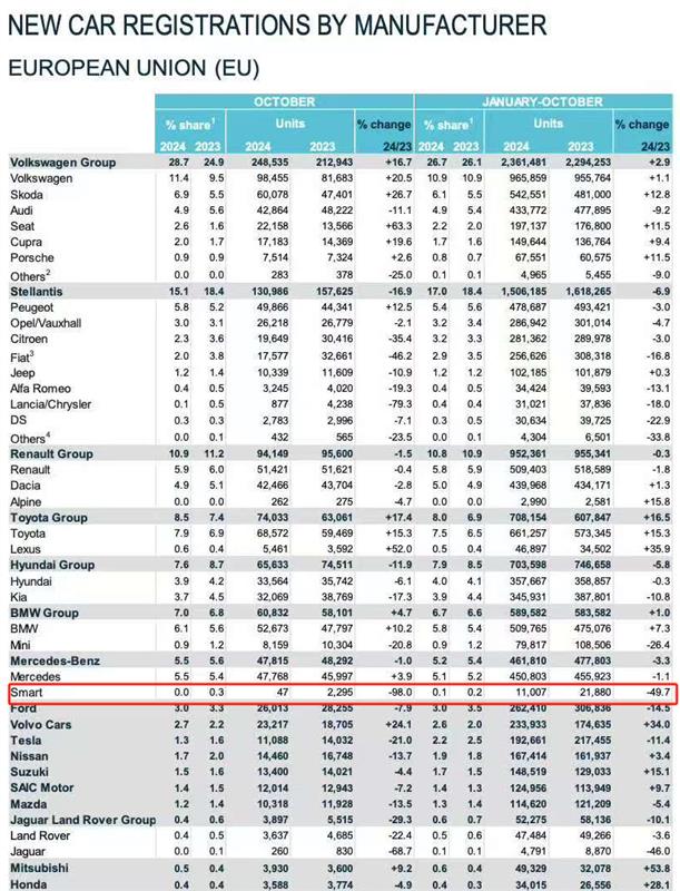而今年下半年以来,smart的欧洲攻势已经近乎停滞,欧洲汽车工业协会(ACEA)数据显示,10月,smart欧洲销量47辆、同比暴跌98%。此前的6-9月,smart欧洲销量分别为1731辆、76辆、36辆、40辆。前1-10月,smart欧洲销量1.1万辆,比去年的2.18万辆,同比暴跌49.7%近乎腰斩。