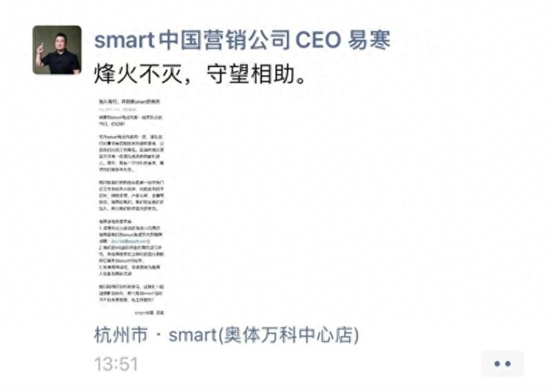 日前,smart中国营销公司CEO易寒在其个人社交平台隔空喊话,称希望邀请极越一线零售门店员工加入smart中国,并配文“烽火不灭,守望相助”。易寒的这一番表态将smart品牌拉到聚光灯下,极越的“暴雷”事件是12月行业中最大的热点之一,车主、员工、供应商以及股东成为事件中几大受害方。