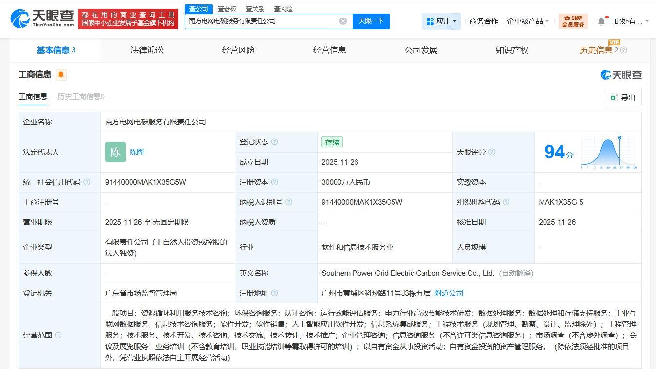 天眼查工商信息显示,近日,南方电网电碳服务有限责任公司成立,法定代表人为陈晔,注册资本3亿人民币,经营范围含资源循环利用服务技术咨询、电力行业高效节能技术研发、数据处理服务、数据处理和存储支持服务、工业互联网数据服务、信息技术咨询服务、人工智能应用软件开发、信息系统集成服务等。股东信息显示,该公司由中国南方电网有限责任公司全资持股。