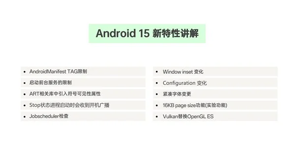 随后,纪昌杰全面且深入解析了 Android 15 的一系列新特性,特别是 Manifest TAG 限制、前台服务的启动限制、以及 ART 库中符号可见性属性的更新,这些改动旨在提高应用的安全性和性能,限制非公开 API 的访问,并确保服务的透明度与系统的及时响应。此外,纪昌杰还对 Android 15 一些较小的更新进行了说明,如紧凑字体变更、提升的最低可安装目标 API 级别、Vulkan 替换 OpenGL ES、包名校验,以及 16KB page size 等功能。