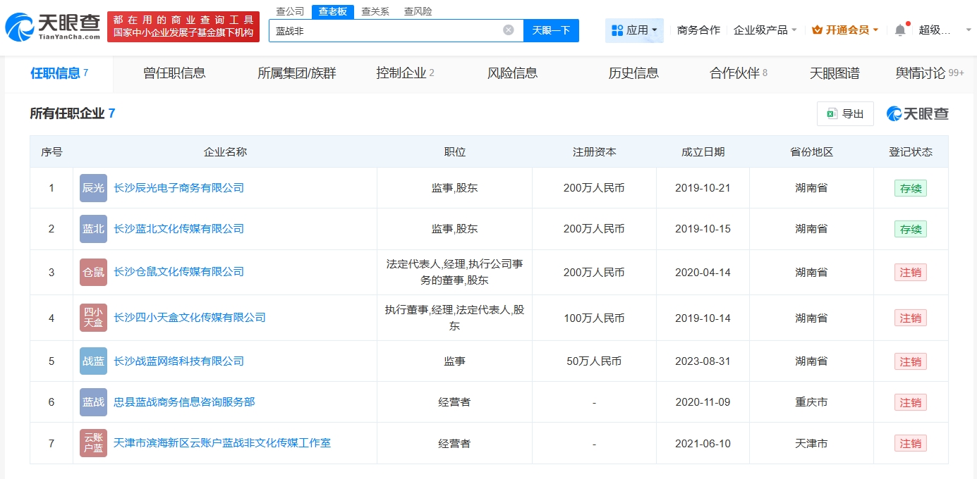 天眼查任职信息显示,蓝战非名下关联7家企业,其中5家已注销,仅长沙辰光电子商务有限公司、长沙蓝北文化传媒有限公司为存续状态。