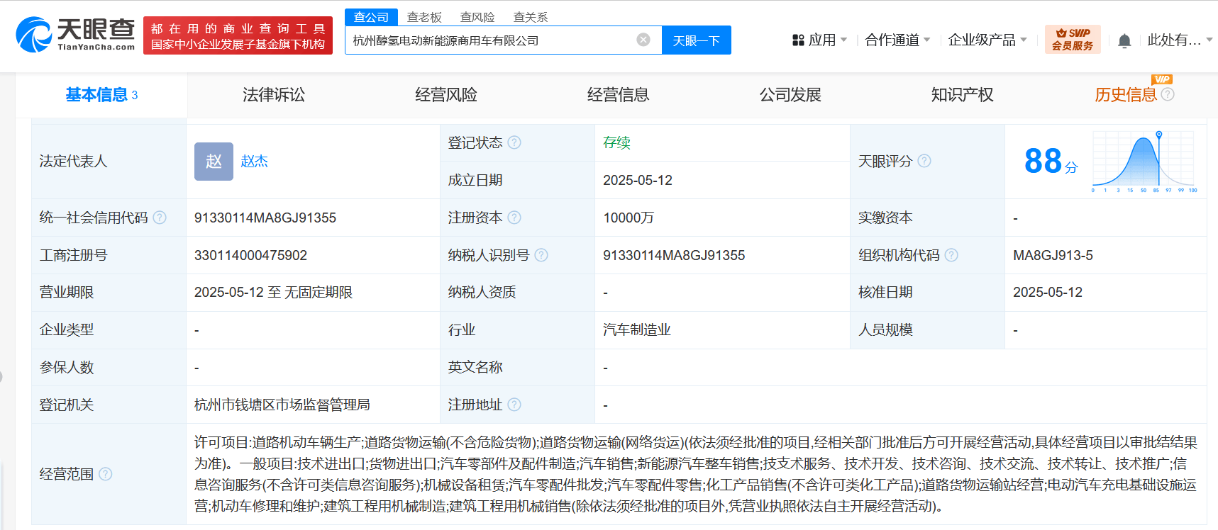 近日,杭州醇氢电动新能源商用车有限公司成立,法定代表人为赵杰,注册资本1亿,经营范围含道路机动车辆生产、道路货物运输、技术进出口、货物进出口、汽车零部件及配件制造、汽车销售、新能源汽车整车销售、信息咨询服务等。
