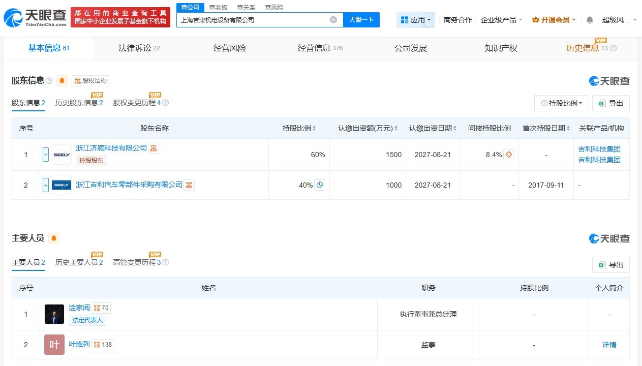 该公司成立于2017年9月,法定代表人为淦家阅,注册资本2500万人民币,经营范围包括机电设备、电气设备领域内的技术开发、技术转让、技术咨询、技术服务等。股东信息显示,该公司由浙江济底科技有限公司、浙江吉利汽车零部件采购有限公司共同持股。