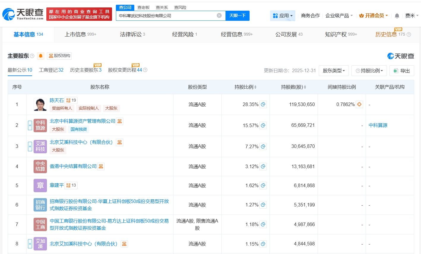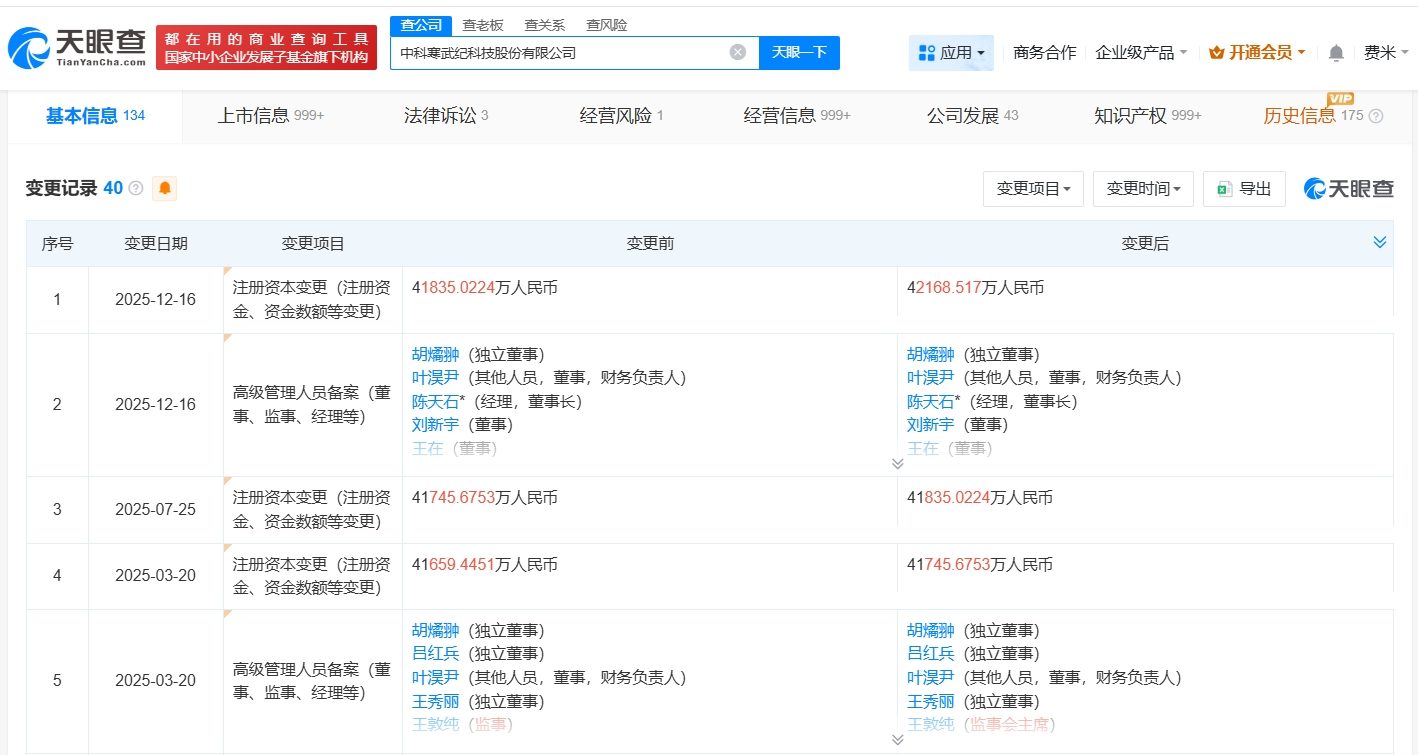 天眼查工商信息显示,中科寒武纪科技股份有限公司成立于2016年3月,法定代表人为陈天石,注册资本约4.2亿人民币,经营范围包括计算机系统服务、软件开发、销售计算机软件及辅助设备等。股东信息显示,该公司由陈天石、北京中科算源资产管理有限公司、香港中央结算有限公司等共同持股。变更记录显示,该公司去年曾多次增资。对外投资信息显示,该公司对外投资20家企业,包括上海寒武纪信息科技有限公司、安徽寒武纪信息科技有限公司等。