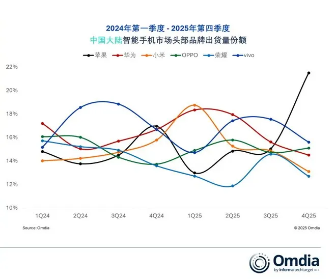 但荣耀的上扬态势未能在年底继续保持,随着四季度苹果 iPhone 17 系列上市,苹果虹吸了绝大部分市场玩家份额。Omdia 数据显示,苹果当季市场份额达到 22%,年增长率高达 26%,多数中国品牌均出现明显下滑,荣耀再度被挤出前五阵营。