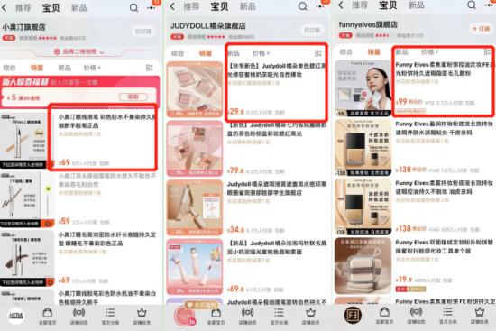 除了眼线笔之外,小奥汀的眉笔、睫毛膏等产品在天猫的月销量,也稳定在了2w左右;橘朵的眼影盘、遮瑕、唇釉等多款产品,在天猫的付款人数都突破了5w;funnyelves继粉饼之后推出的两款粉底类产品,月销也达到了1w+。