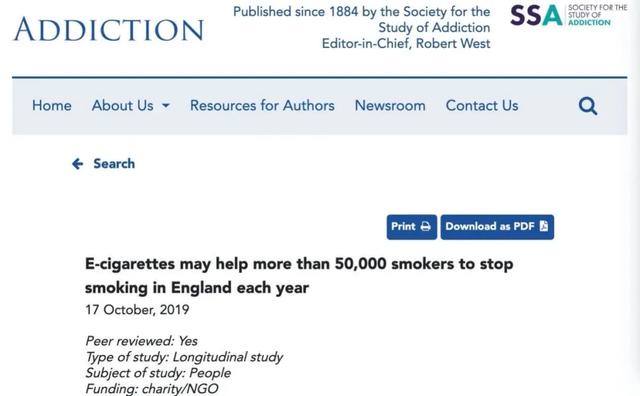 英国伦敦大学学院(University College London)发表在国际知名学术期刊《瘾》上的研究结果指出,电子烟一年帮助至少5万英国烟民成功戒烟。
