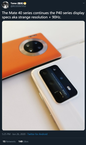 据推特网友@RODENT950 26 最新发布的消息显示,与此前曝光的消息基本一致,全新的华为Mate40系列将基本延续P40系列的屏幕参数,分辨率依旧为2640 x 1200,屏幕刷新率则有90Hz和120Hz两个可能,目前还不确定该系列是否统一标配120Hz刷新率,也有可能90Hz/120Hz共存的高低配策略。