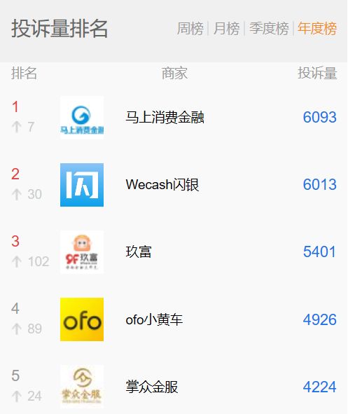 目前在聚投诉年度榜单上马上消费金融以微弱优势占据第一,闪银和玖富分居第二和第三位,都领先于已经资金链断裂的小黄车ofo。