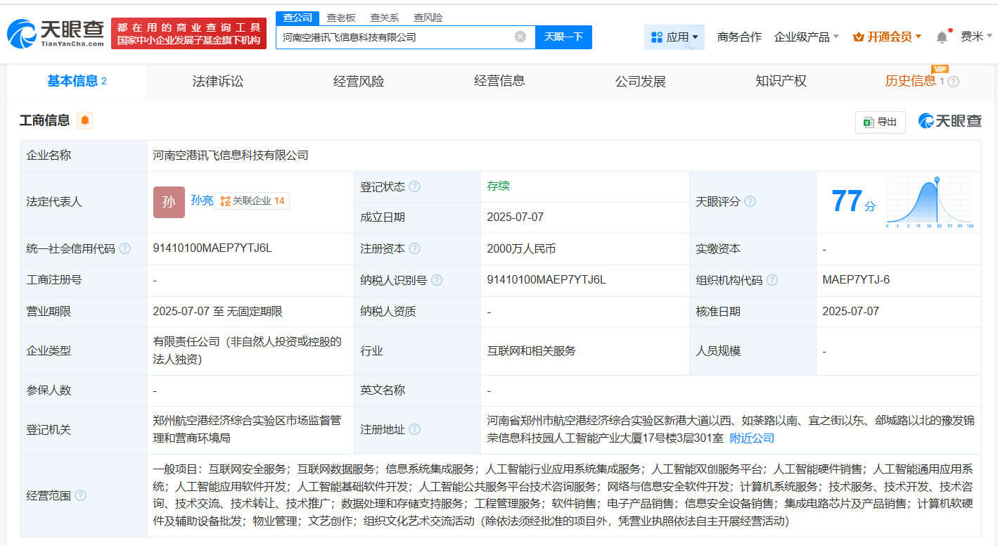 天眼查App显示,近日,河南空港讯飞信息科技有限公司成立,法定代表人为孙亮,注册资本2000万人民币,经营范围包括互联网安全服务、互联网数据服务、信息系统集成服务、人工智能行业应用系统集成服务、人工智能双创服务平台、人工智能硬件销售等。
