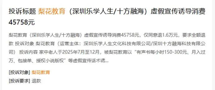 在黑猫平台上,有用户表示:家中老人2025年7月到12月之间,被梨花教育用“有声书每小时150-300元、月入过万、包接单、授权小说版权”等虚假宣传诱导下先后支付了45758元购买其有声书课程以及配套设备(其中包含4999元和7999元的设备费)。