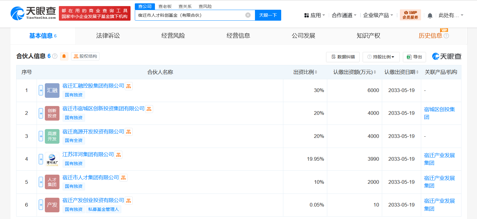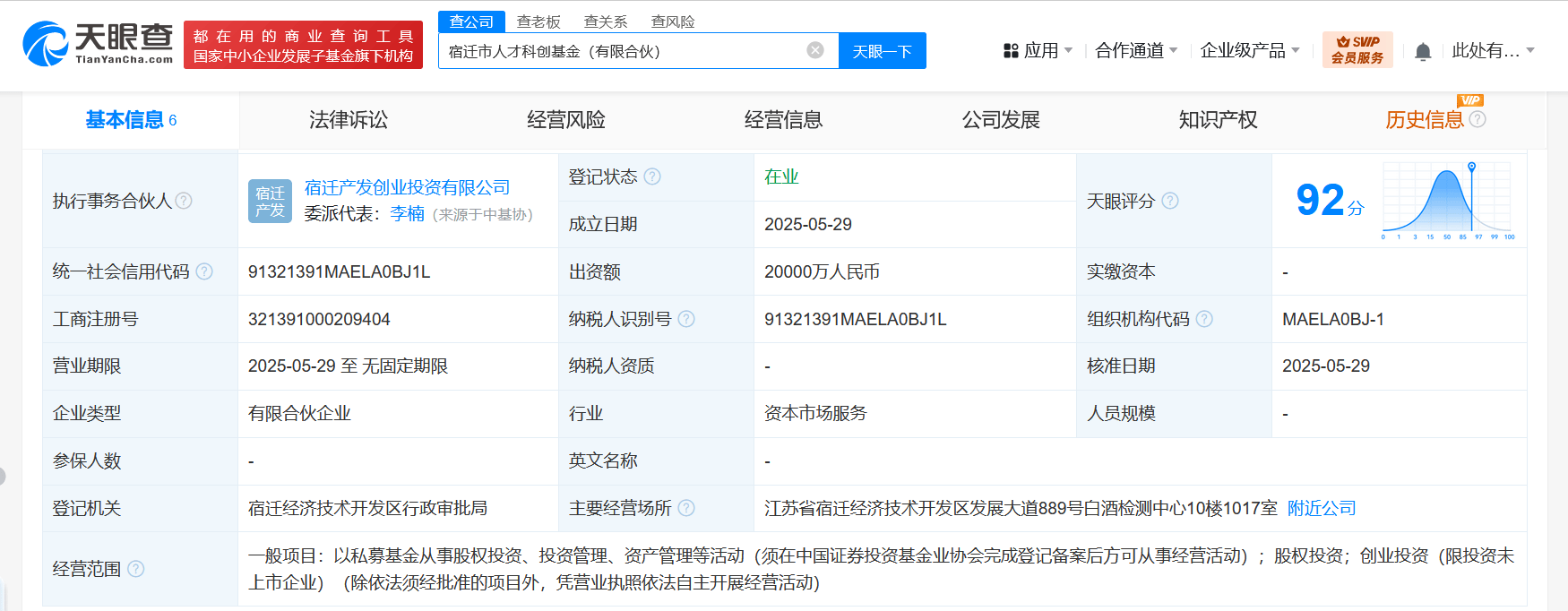 天眼查App显示,近日,宿迁市人才科创基金(有限合伙)成立,执行事务合伙人为宿迁产发创业投资有限公司,出资额2亿人民币,经营范围为以私募基金从事股权投资、投资管理、资产管理等活动,股权投资,创业投资。合伙人信息显示,该基金由宿迁汇融控股集团有限公司、宿迁市宿城区创新投资集团有限公司、宿迁高源开发投资有限公司、江苏洋河集团有限公司、宿迁市人才集团有限公司、宿迁产发创业投资有限公司共同出资。