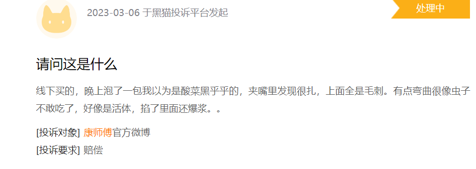 在黑猫平台上搜索康师傅,其投诉量共有两千多条结果,其中不乏“面里有头发”、“面里有黑色异物”、“面里疑似有可爆浆活体”等投诉内容,当然,其真实性仍有待考证,我们对此不置可否。