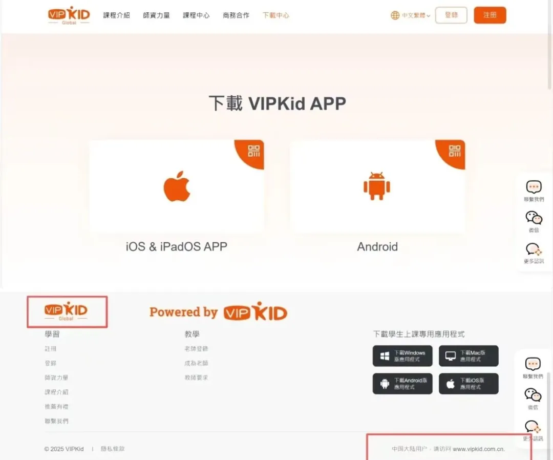 刘娜向北京商报记者出示了班主任所发的学生端上课软件下载网址。北京商报记者注意到,该网址中还有“zh-hk”的字样。点击该网址后,出现了VIPKID Global官网的VIPKid App下载页面,其显示语言为中文繁体。但该网址并非VIPKID的中国大陆官网,该页面右下角提示,中国大陆用户需要访问另一个后缀为“cn”的网址。