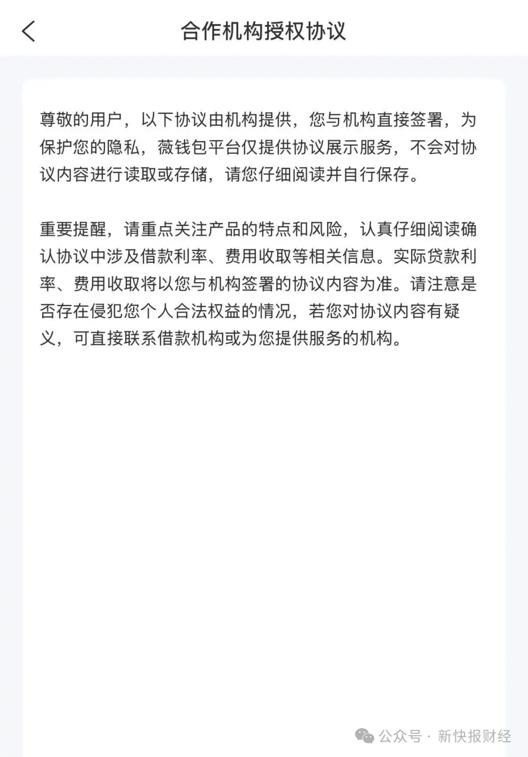 以乐享通为例,薇钱包页面显示,贷款额度由乐享通提供,点击激活额度时须先同意《乐享通协议》,但打开合作机构授权协议却显示空白页面,没有任何贷款平台协议信息。