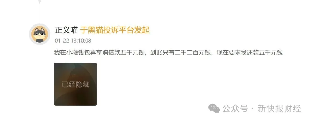 除了薇钱包,同一小贷牌照主体下的另一个贷超平台小薇钱包亦遭大量用户投诉。比如在投诉平台上,消费者称在小薇钱包喜享购借款五千元钱,到账只有二千二百元。