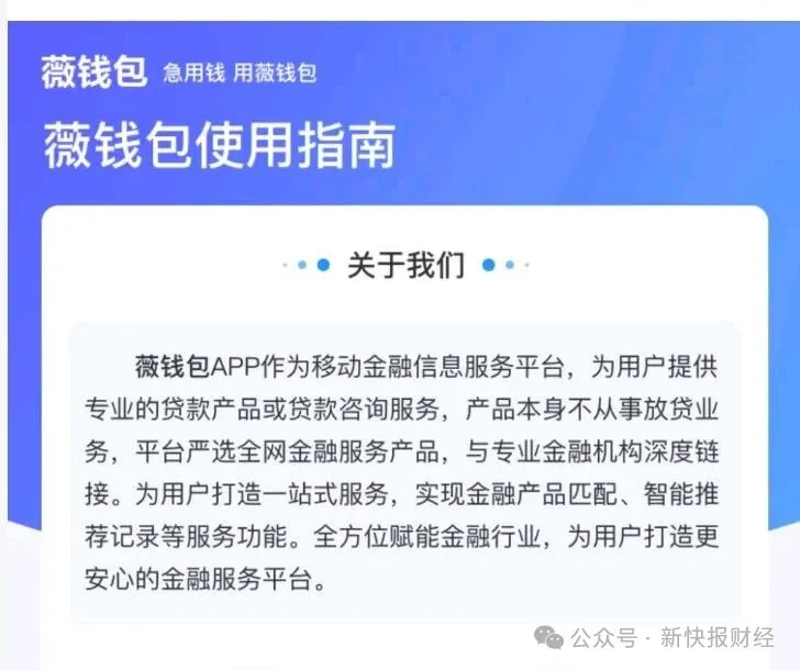 需要说明的是,薇钱包作为移动金融信息服务平台,为用户提供贷款产品或贷款咨询服务,产品本身不从事放贷业务,相关用户投诉或指其导流的贷款产品。