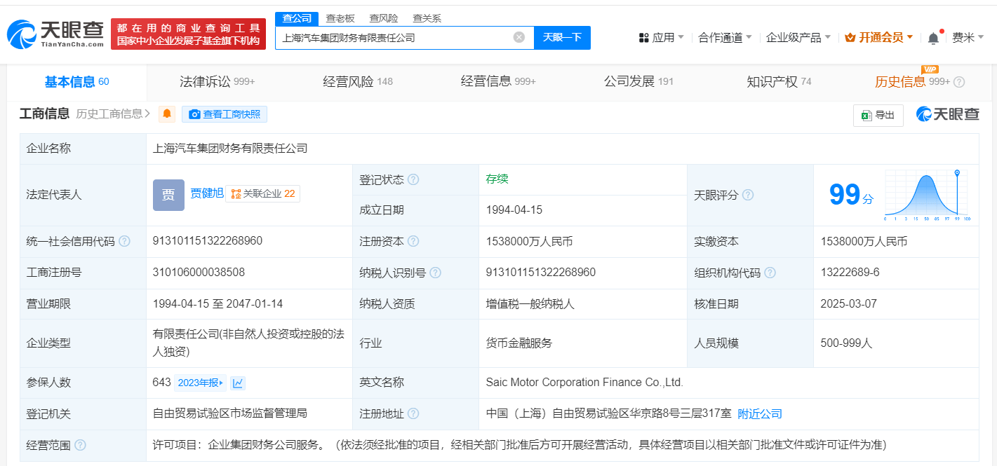 天眼查App显示,近日,上海汽车集团财务有限责任公司发生工商变更,王晓秋卸任法定代表人、董事长,由贾健旭接任,同时多位高管发生变更。