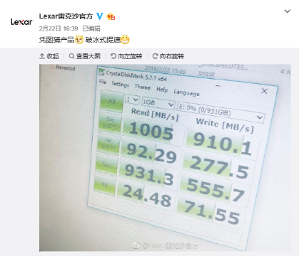 近日,Lexar雷克沙官方微博爆出一款破千MB/s读写速度的移动固态硬盘,1005MB/s的数据格外引各路机友关注,按照雷克沙一贯的产品风格和技术积累,猜测本次曝光的应该就是雷克沙便携式固态硬盘的参数。