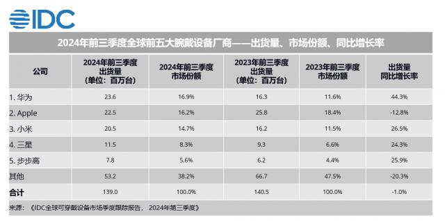 【TechWeb】根据IDC最新发布的《全球可穿戴设备市场季度跟踪报告》报告显示,尽管2024年前三季度全球腕戴设备市场出货量出现下滑,但中国市场仍然保持了20.1%的同比增长率,持续引领全球增长。华为表现尤为亮眼,前三季度全球出货量同比增长44.3%,以16.9%的市场份额位居全球首位;在国内市场,华为同样以35.7%的市场份额占据榜首。至此,华为前三个季度在全球腕戴市场累计出货量第一,彰显出其在智能穿戴领域的深厚积累与卓越实力。