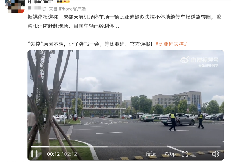 根据网上流传的视频显示,一辆比亚迪汉在成都天府机场停车场内疑似失控,不停地绕停车场道路转圈,目击者称车辆无法正常刹车,持续转圈约三四十圈。