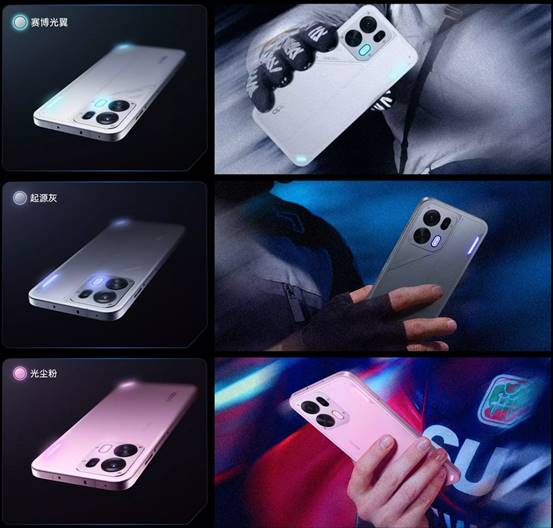 配色上,该机提供四款差异化选择,其中赛博光翼为主打配色,采用 3D 机能风纹理,斜向线条在光线照射下呈现锯齿纹理与立体光影效果,镜头延伸区域的像素风格设计更添科技感;光尘粉柔和清新、起源灰沉稳低调,满足日常简约审美;而金色传说则采用行业首个原厂锻造碳工艺,每一台的纹理都独一无二,打造专属高端质感。