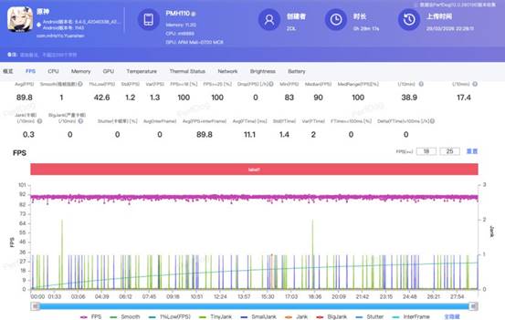 在对性能要求更高的《原神》中,开启高画质 +超帧90 帧设置,那夏镇跑图半小时的平均帧率稳定在 89帧左右,无降频、无卡顿,正面最高温度 41.3℃,背面 38.8℃,在同价位机型中表现上乘。