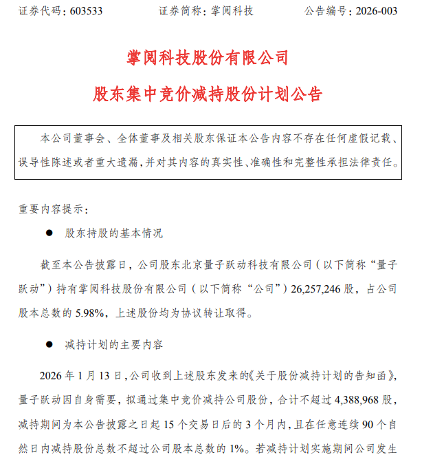掌阅科技股东量子跃动计划减持不超过1%股份快讯