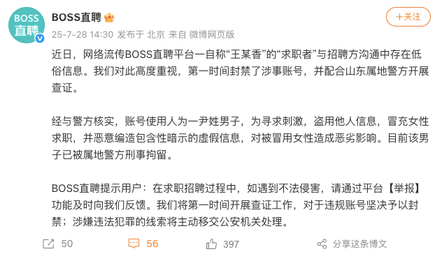 7月25日,BOSS直聘方面回应称,公司已关注到上述事件,目前涉事账号已被平台永久封禁。