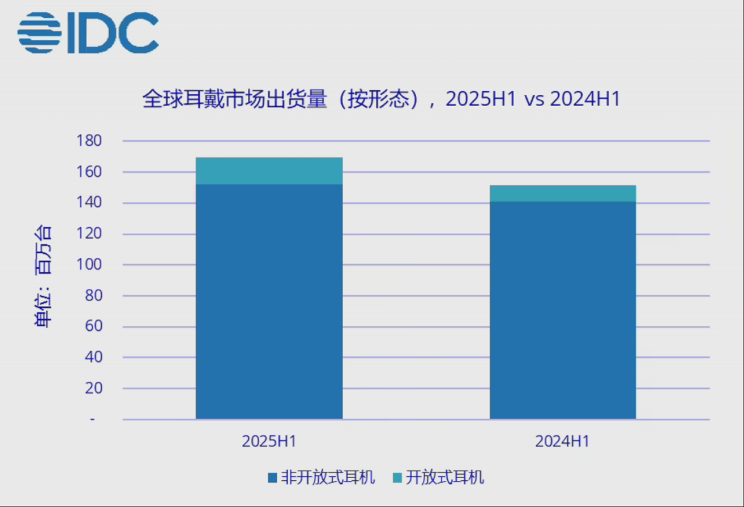 国际数据公司(IDC)最新发布的《全球可穿戴设备市场季度跟踪报告》显示,2025年上半年全球耳戴设备市场出货量达到1.7亿台,同比增长11.8%,其中开放式产品表现尤为亮眼,出货量占比达10.1%,同比增长高达61.1%,凭借新颖的外观设计和创新的传导技术,成为引领全球市场增长的重要力量。