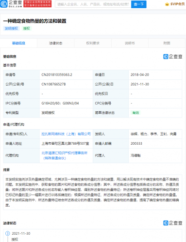 企查查专利摘要显示,本发明实施例涉及热量确定领域,尤其涉及一种确定食物热量的方法和装置,用以解决现有技术中确定食物热量不准确的问题。由于本发明实施例中,所述热量特征结合所述各成分的热值及质量,确定所述食物的热量值,提高了确定食物热量的精确度。