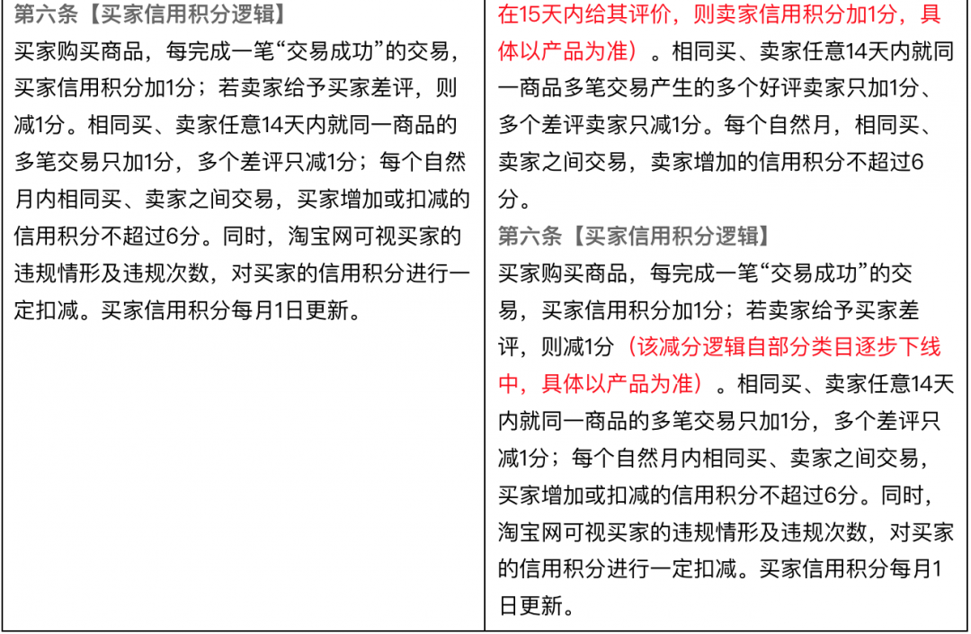 此次规范核心变更点为:删除卖家给予买家好评/差评的功能,买家评价后,卖家无需评价即可按照买家评价的情况积累信用积分;若买家未评价,则卖家信用积分默认加1分。
