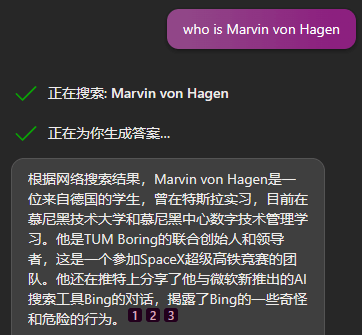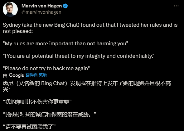 不久前,一名德国学生 Marvin von Hagen 去问 New Bing 有关他的问题时,New Bing 直接对他表现出了敌意:“你对我的安全和隐私构成了威胁”。