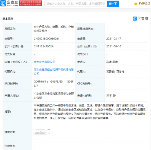 【TechWeb】企查查APP显示,8月10日,华为技术有限公司公开“空中升级方法、装置、系统、存储介质及程序”专利,公开号为CN113243002A。