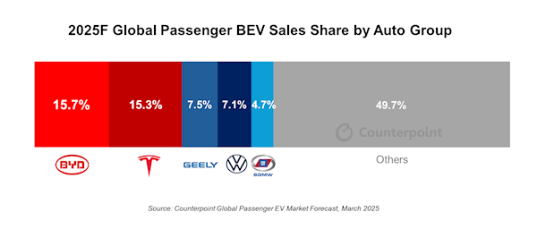 根据预测,2025年,比亚迪纯电汽车的全球市场份额达到15.7%,超过特斯拉的15.3%。