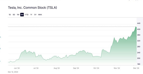 在周四美国股市收盘时,特斯拉报418.1美元,较前一交易日424.77美元的收盘价虽然下跌了6.67美元,但仍远高于11月4日收盘时的242.84美元,在近一个多月的时间里上涨了175.26美元,涨幅超过了70%。按周四收盘时的价格计算,特斯拉的市值为13421.26亿美元。