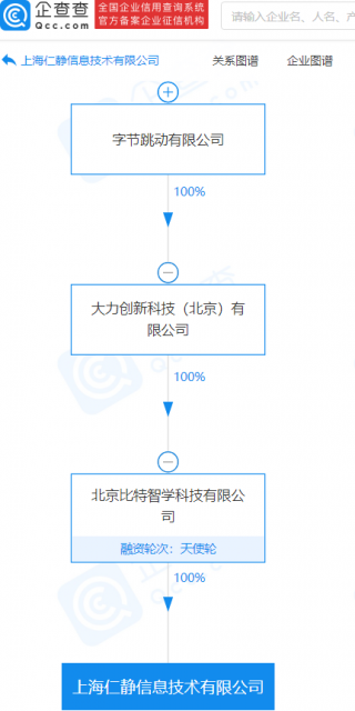 企查查信息显示,该公司成立于2017年,法定代表人为韦雄瀚,注册资本5000万元人民币,由字节跳动关联公司北京比特智学科技有限公司100%控股。